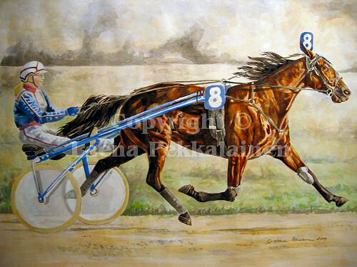 Baron Crown´s name is certainly familiar in the trotting circles in Finland. About 50 starts in a year requires a lot of energy! According to Riina Baron was always eager to go to races, because he loved running. His victories tell a story of their own. When I photographed Baron for the painting, it was clear there was such a connection between Riina and Baron that only comes out of mutual respect. Now Baron has retired but without doubt still wants to do other things also, not only lazy around.
