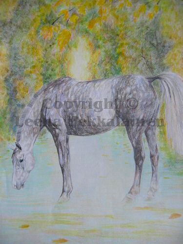 Tämä on vanha kuva, ensimmäinen jonka tein kun minulla oli parikymppisenä varaa ostaa elämäni ensimmäiset oikein taiteilijalaatua olevat akvarellivärikynät. Löysin kuvan kun siivosin kansiota, jossa säilytin vanhoja piirroksiani. Tekniikka on vielä kovin keskeneräinen, mutta tästä se lähti. Ensimmäisiä värillisiä hevostaulujani.
