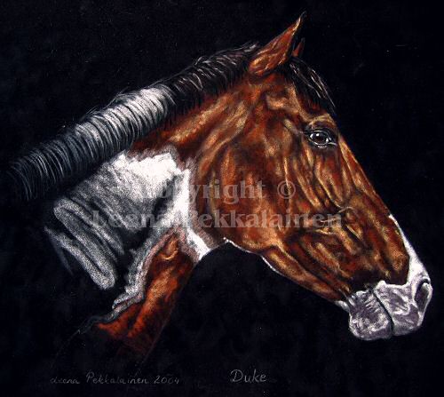 Duke asustaa Englannissa ja tämän muotokuvan tilasi omistajan tytär joululahjaksi äidilleen. Duke on 6-vuotias (isä on hollantilainen lämminverinen ja äiti englantilainen täysiverinen). Duken säkäkorkeus on 173cm, mutta ihmistensä mielestä hän on iso kiltti nallekarhu. No - ehkä hieman jääräpäinen. Hänellä on paha tapa järsiä kankaita - oli kyseessä sitten toisen hevosen loimi tai ihmisen takki. Duke melkein menehtyi pahaan koliikkiin samana vuonna kun tein taulun ja pelastui vain leikkauksella omistajiensa suureksi helpotukseksi. Dukella oli onni päätyä 11kk ikäisenä hyvään kotiin, jossa hän on täysi, rakastettu perheenjäsen. Se on käynyt ilmi niistä kirjeistä, joita olemme omistajan tyttären kanssa kirjoittaneet. Kenties joku päivä saan tavata Duken ihan henkilökohtaisesti.